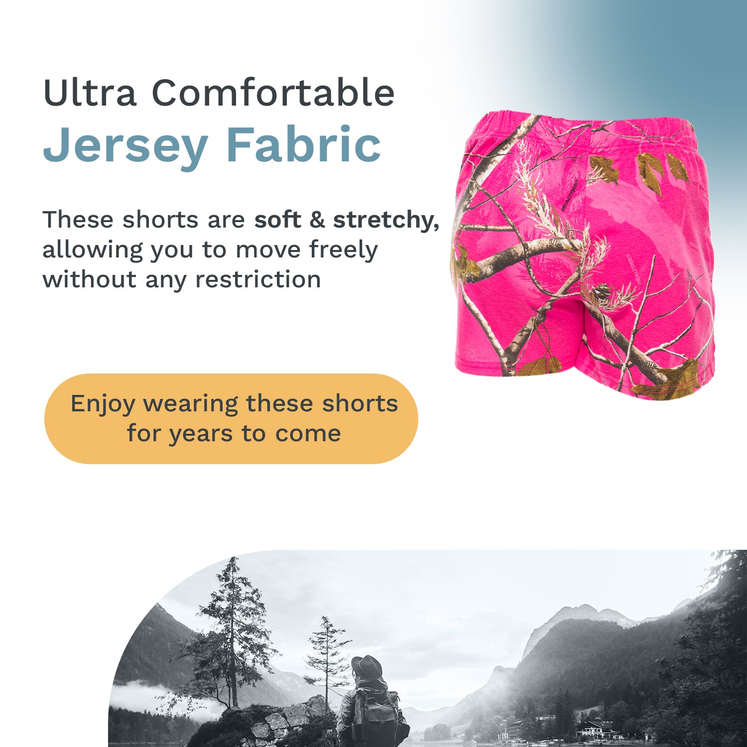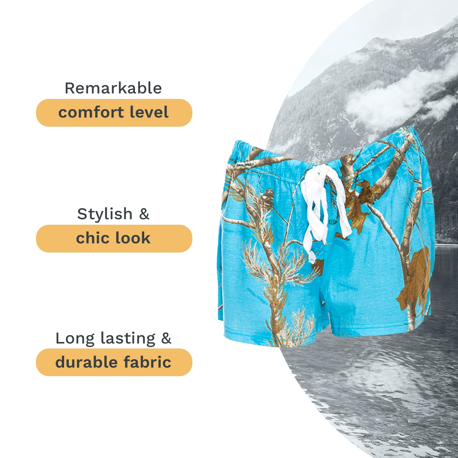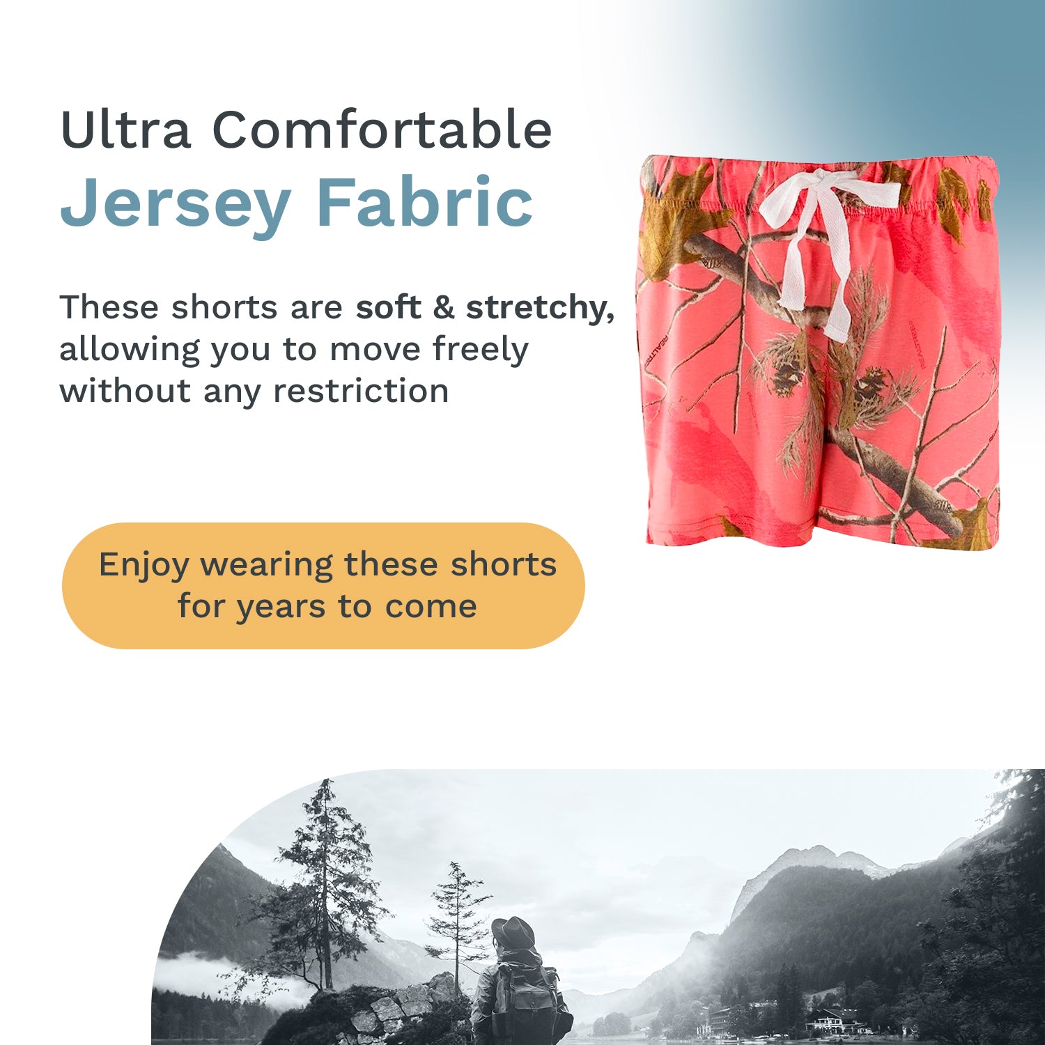 Women’s Lounge Shorts in Camo. Who says camo is just for hunting? Stay comfortable and stylish with our new line of women’s camo lounge shorts. These shorts feature a stretchy elastic waistband to ensure fit and comfort. Made of light weight breathable cotton-poly jersey, these sleep shorts will keep you cool all night. The shorts are perfect for sleepwear, nightwear, and lounging. Show your love for the outdoors with these camo women’s lounge shorts. Available in multiple colors and sizes.