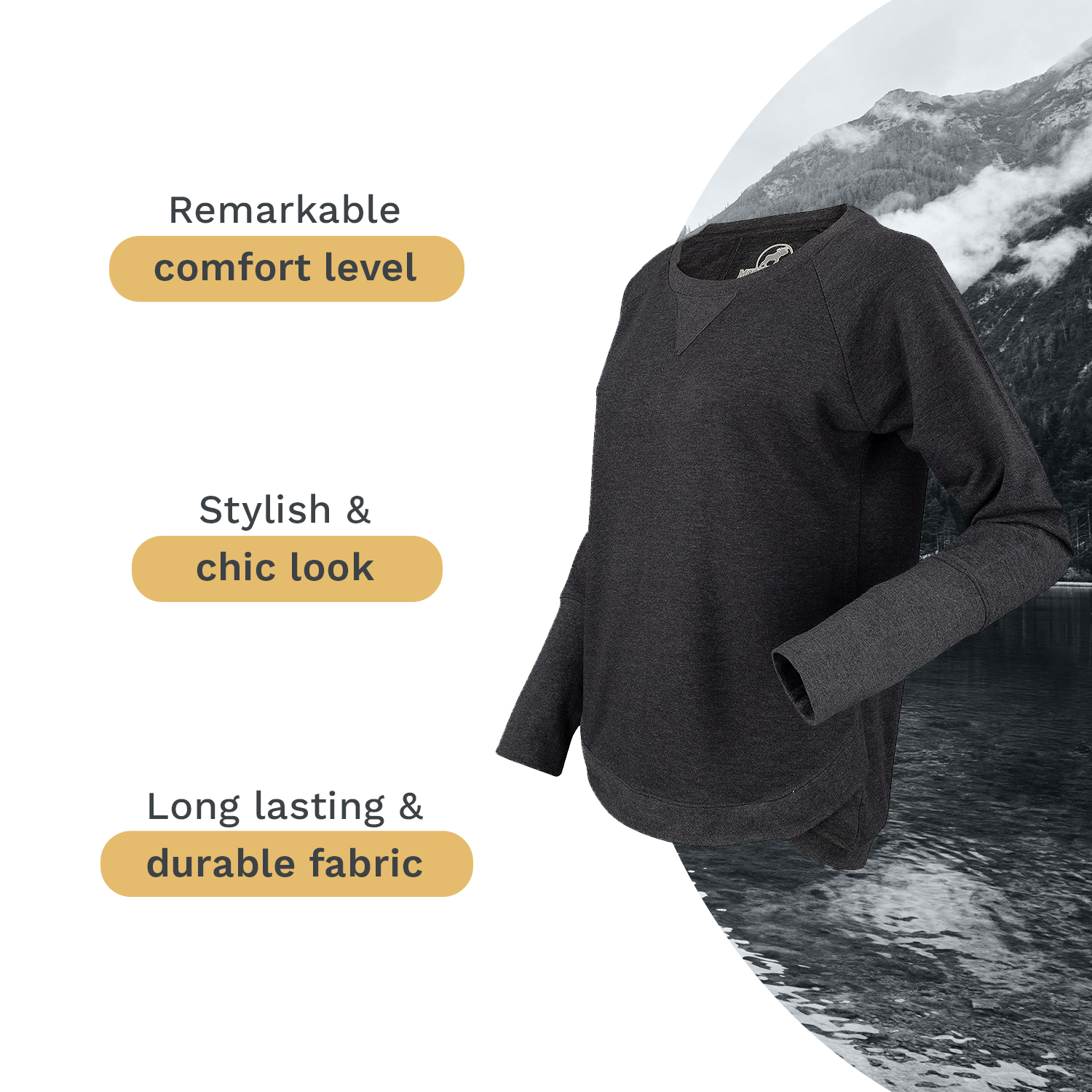 - Benefits: V-Notch Collar with Ribbed Neck, Cuffs + Waistband. Overlapping Scooped Hem Line, Raglan Sleeves & Center Back Paneling. Great for Keeping Warm on Your Next Adventure!