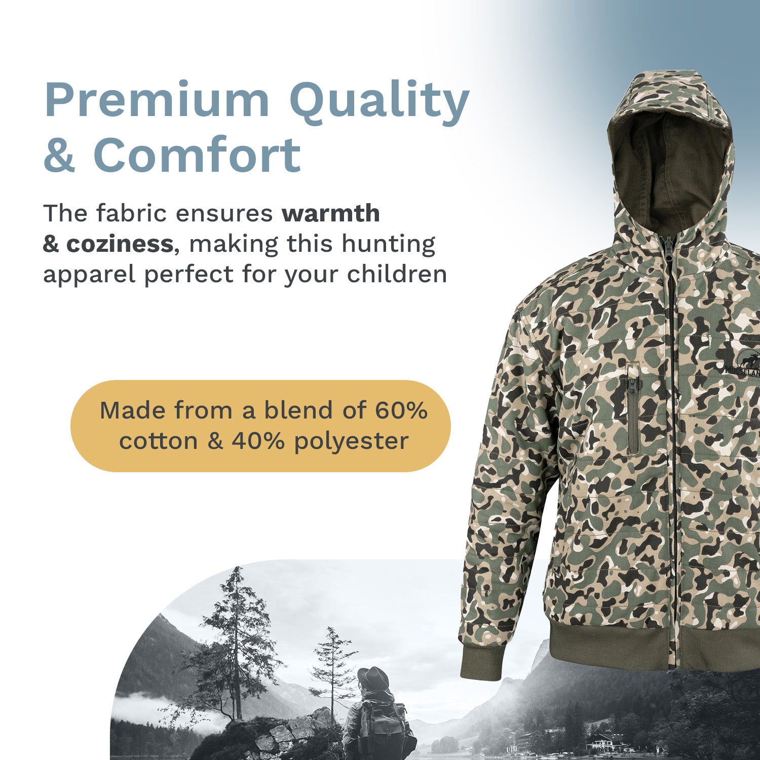 - Essential Hunting Apparel: Featuring a full zip hoodie design, this camo jacket is perfect for young hunting enthusiasts; This jacket is ideal for hunting, providing warmth and comfort in a practical camo pattern; Stay warm and stylish in the great outdoors with this essential piece of adventure gear